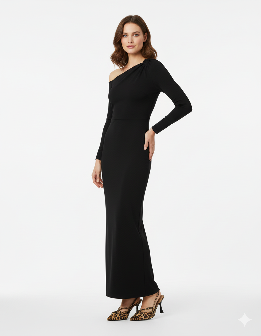 ABITO MIDI, CON SPALLA DRAPPEGGIATA E MANICHE LUNGHE