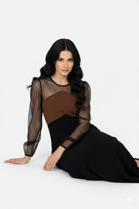 ABITO LUNGO, CON MANICHE IN TULLE E INSERTI COLORATI